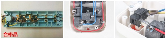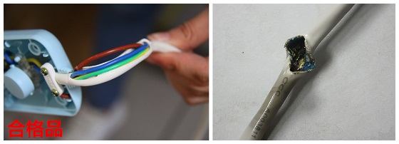 大家通過仔細(xì)觀察可以看到劣質(zhì)產(chǎn)品已經(jīng)完全融化了,這就是之前提到的排插線材問題。由于線材質(zhì)量太差,在長時(shí)間的家庭使用中,過載的電流把劣質(zhì)的線材融化,而插頭也因?yàn)殡娏鞯膿舸蚨麄€(gè)壞掉了。