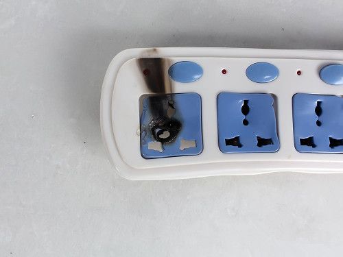 ?最后讓我們來看看一款已經(jīng)被整個(gè)燒融的排插,讓大家更清楚明白排插的選用材料的重要性。