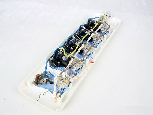 這一款排插在使用過程中,可以看到在最后一個(gè)插口位置已經(jīng)有燒焦的痕跡,顯然是已經(jīng)發(fā)生了安全問題,接口已經(jīng)被燒壞了。我們可以把它打開來看看,究竟它的問題出在什么地方。