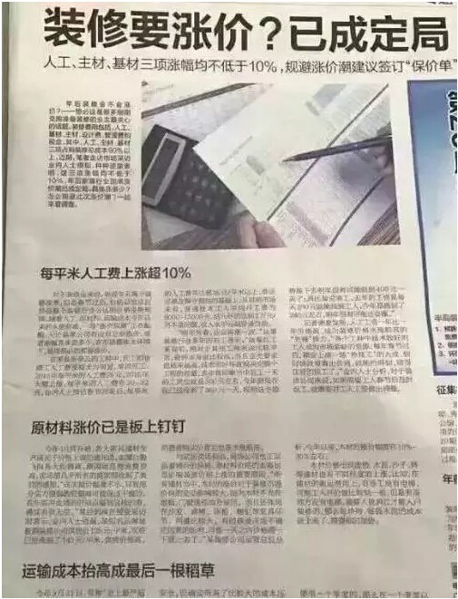 2017年,裝修市場成本漲價達20%~35%,所以有的東西還是早點定下來,漲價已成趨勢,早買早賺到早裝修早賺到。