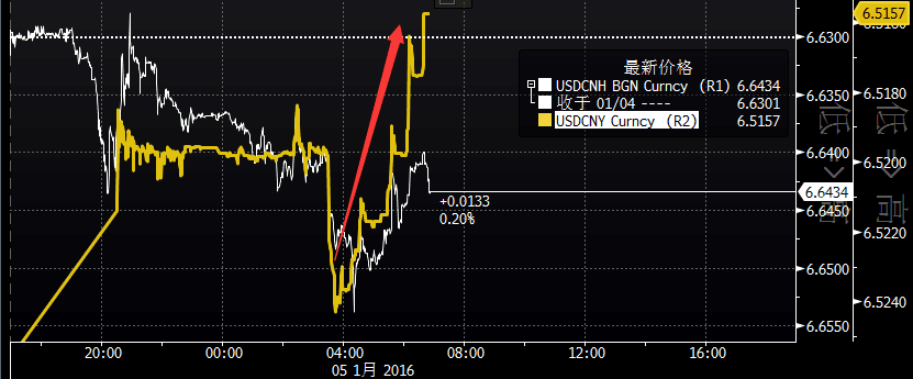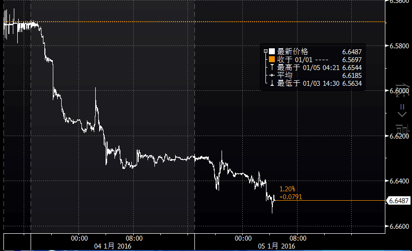2016年開年頭兩個交易日,離岸人民幣走勢:貶值近800基點