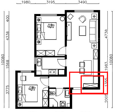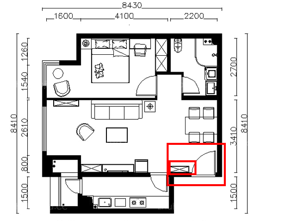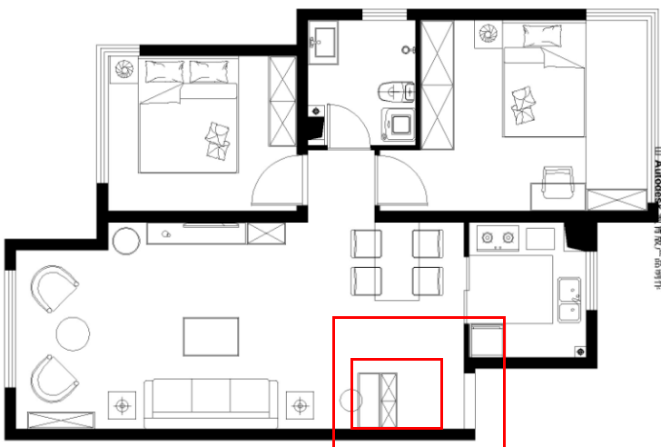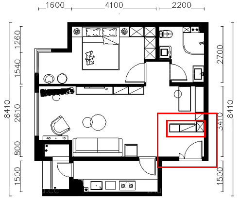 在中小戶型里,這是一種較常見的沒玄關(guān)類型,對中小戶型來說,玄關(guān)處又是一個比較重要收納空間。因而,需要設(shè)法打造一個。設(shè)計師最常用的就是靠墻做一個鞋柜(上圖小紅框),省時省力省事,也能滿足業(yè)主一般需求。