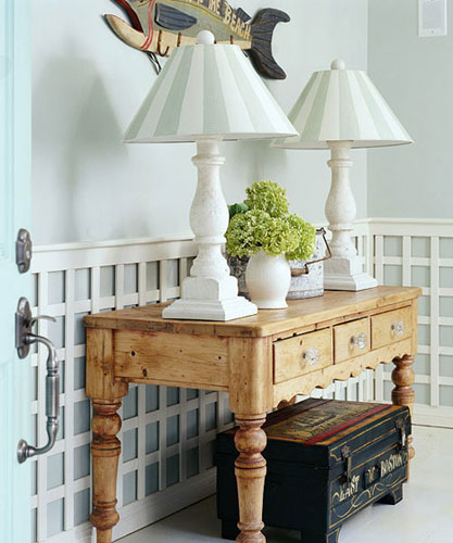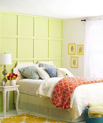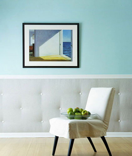 通過(guò)木板和織物裝點(diǎn)墻面,先將護(hù)墻板固定在一個(gè)高度,在填充上泡沫塑料或者是棉花,再裝飾上好看的布料,釘上紐扣,立刻就讓前面獨(dú)特起來(lái)。
