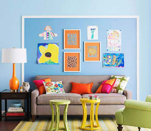 家中孩子的繪畫(huà)作品總是不少,那就利用這些繪畫(huà)成為裝飾墻面的元素,展示孩子最喜歡的作品。制作一個(gè)大大的墻框架,中間涂成藍(lán)色,錯(cuò)落有致的擺放上孩子的繪畫(huà)作品。