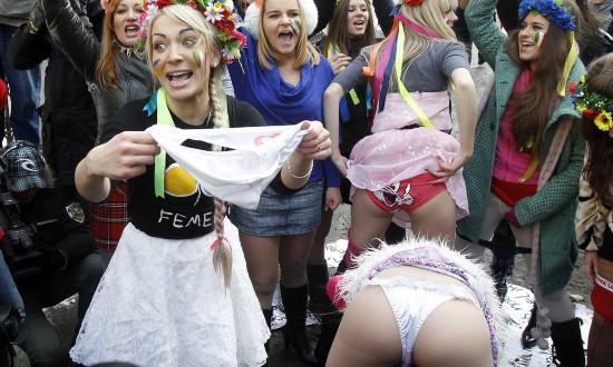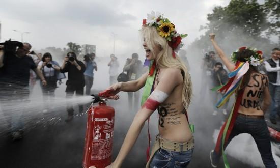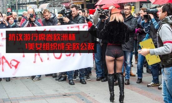 嘗到甜頭后,她們開始頻繁在歐洲杯的重要時間節(jié)點出現(xiàn):2011年6月,她們在身上著“2012歐洲杯拒絕賣淫”,攪亂了歐洲杯倒計時一周年活動;7月,她們身涂彩繪,手捧足球,在噴泉中洗浴抗議烏克蘭可能因為外地球迷大量涌入而暫停居民夏季熱水供應(yīng)……