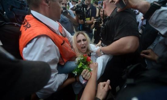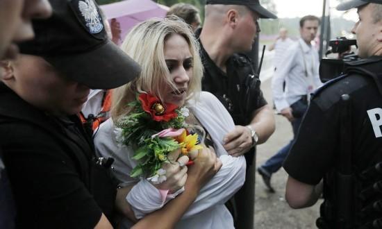 2012歐洲杯期間,又有一大批東歐妓女從西歐和鄰國涌向烏克蘭和波蘭。為了吸引來自西歐的闊綽球迷,這些性工作者準備充分,補習(xí)了16個國家的歷史和足球知識。色情場所也花費巨額資金進行裝修,以便讓球迷能邊享樂邊看球。圖為抗議性工作的費曼成員被抓走。
