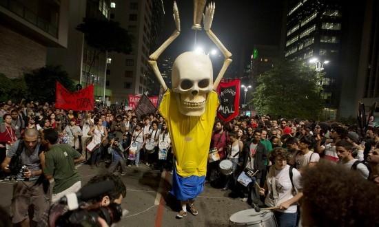 圣保羅當(dāng)?shù)貢r間2014年5月15日,巴西世界杯抵制活動升級,抗議者裝扮成骷髏挑釁,還焚燒物品,火光沖天。當(dāng)時距離世界杯開幕僅有一個月,巴西當(dāng)?shù)氐目棺h行動卻愈演愈烈,民眾們走上街頭,再次針對世界杯的巨大成本進行抗議。