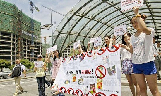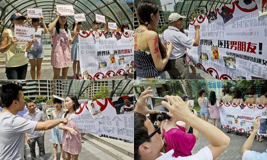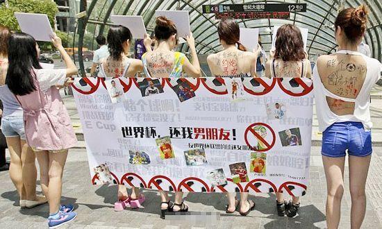 她們在世紀大道地鐵站外、人民公園外和美羅城外抗議,舉牌號召“世界杯,還我男朋友”,還寫上了各種各樣控訴“標語”,例如“別拿你的WorldCup挑戰(zhàn)我的ECup”、“輸球了別拉我自殺”、“在辦公室談足球的男人都是娘娘腔”、“家庭主婦≠足球怨婦”和“我要生了!老公你在哪里?”。