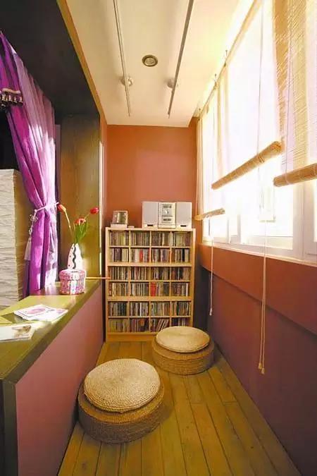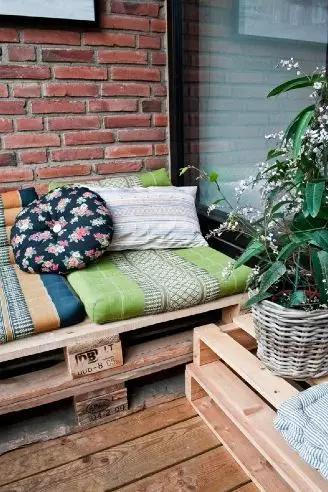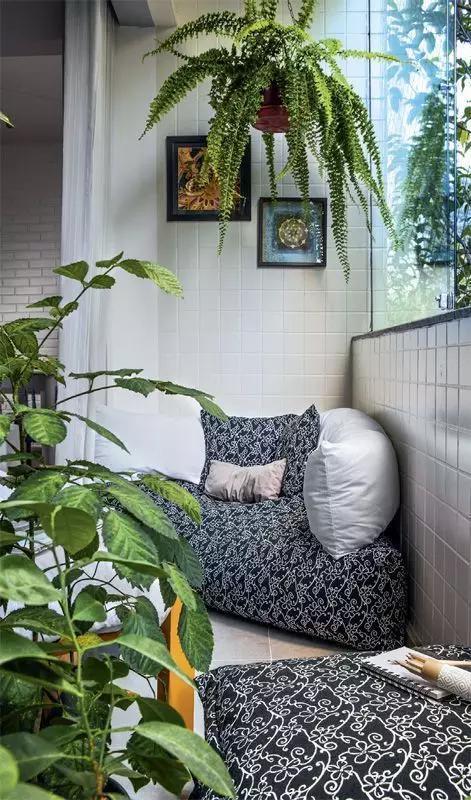 如果只需滿足坐著看書的需要,一把上好的椅子足矣(圖中的顯然不夠舒服…),百葉窗和窗邊小擱板都是亮點(diǎn)。2▲ 一半綠植+花架,另一半長(zhǎng)椅+抱枕+小茶幾你看書不妨礙我種花,看書累了,抬起頭就是一片蔥郁。如果家里準(zhǔn)備裝修,可以考慮將小陽(yáng)臺(tái)做高一級(jí)變身榻榻米閱讀角;如果家已成型,只能小打小鬧地改造,照樣可以鋪上戶外地板增加親膚感。此時(shí)透光竹簾比百葉窗更搭~陽(yáng)臺(tái)小,更要每一寸地兒都要用好!在這里,轉(zhuǎn)角書桌將陽(yáng)臺(tái)的死角活用起來,構(gòu)成了一個(gè)圍合的工作區(qū),對(duì)于家里沒有書房又需要工作區(qū)的小兩口很有借鑒意義。可以采取兩張長(zhǎng)桌拼合的方式實(shí)現(xiàn)。如果陽(yáng)臺(tái)實(shí)在太窄做不了轉(zhuǎn)角書桌,利用一整面墻的垂直空間也是極好的,而且全部使用隔板實(shí)現(xiàn),費(fèi)用不會(huì)很高。6▲ 木卡板+坐墊+抱枕還記得周二的「家的畫面」里提及的“木托盤”嗎,對(duì)于陽(yáng)臺(tái)改造,依舊是萬能的!某寶搜索關(guān)鍵詞#木卡板#,像圖中這樣的砌法兩張毛爺爺左右搞掂。如果用在陽(yáng)臺(tái),記得要買通過防潮防腐標(biāo)準(zhǔn)的。